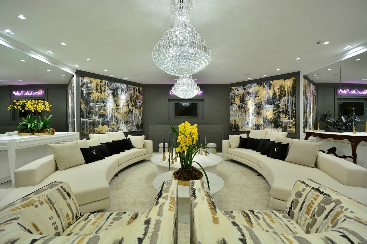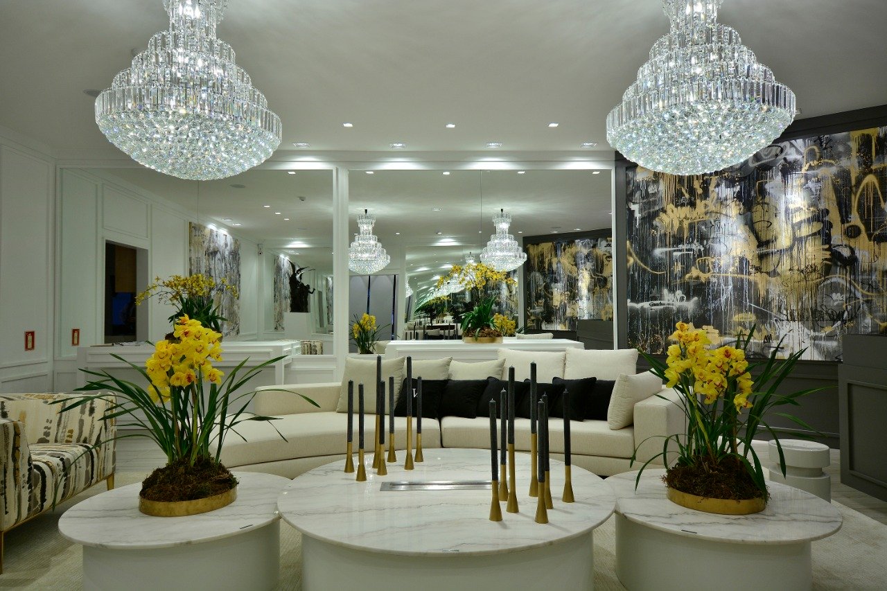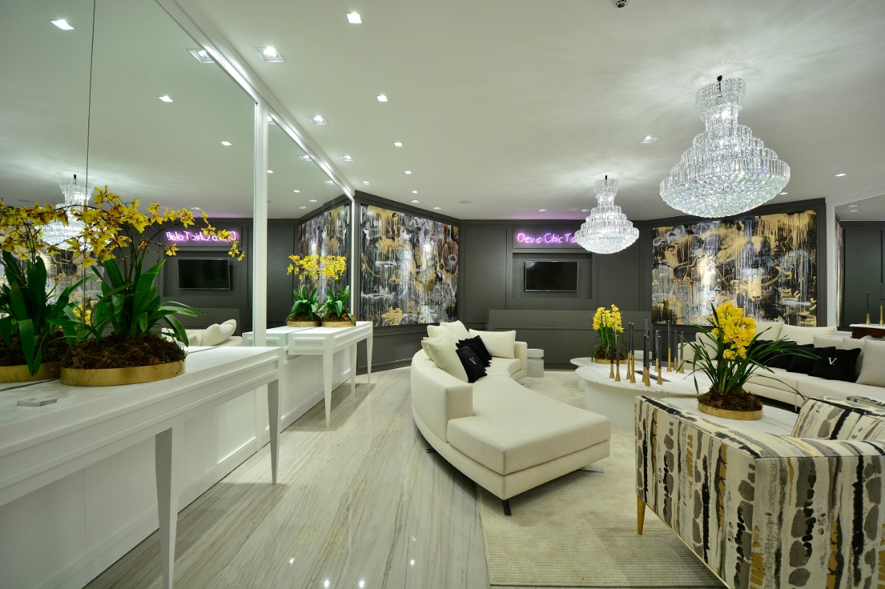 Lounge Deu o Chic celebra a coluna social mais badalada do Estado, assume a forma de um ambiente cosmopolita idealizado para diversão e interação dos visitantes, nesse ambiente nossa soluções foi com os espelhos utilizados nesse espaço.